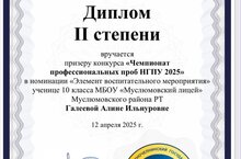 Ученица 10 психолого-педагогического класса Муслюмовского лицея Галеева Алина удостоилась диплома II степени республиканского конкурса «Чемпионат профессиональных проб НГПУ 2025» в номинации "Элемент воспитательного мероприятия", организованного ФГБОУ ВО «Набережночелнинский государственный педагогический университет». Алина предоставила на конкурс элемент воспитательного мероприятия на тему «Мы помним!», которое она провела в 3а классе.