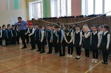"Час маршировки" учащихся начальных классов. Идет подготовка к смотру строя и песни. Старшеклассники под руководством преподавателя-организатора ОБЖ Хатбуллина Т.Л. помогают младшим правильно шагать и выполнять команды.