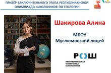 Ученица 11 класса Шакирова Алина- призёр заключительного этапа республиканской олимпиады школьников по геологии. Учитель - Смелов Рустем Робертович. Поздравляем!