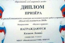 Ученик 4 класс Казаков Л. принял участие в II республиканском конкурса "Юный исследователь- 2018" и стал призером(руководитель Сафина Ч.Р.) Молодцы!