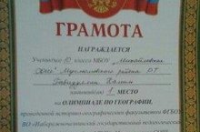 Прошла региональная олимпиада по географии на базе историко-географического факультета Набережночелнинского государственного педагогического университета. Ученик 10 класса нашей школы Габидуллин К. занял 1 место (учитель Смелов Р.Р.).Поздравляем!!!