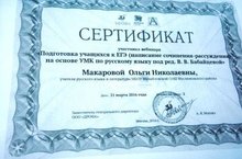Макарова О.Н. ,учитель русского языка и литературы, посетила вебинар по теме "Подготовка учащихся к ЕГЭ ( написание сочинения - рассуждения) на основе УМК по русскому языку.