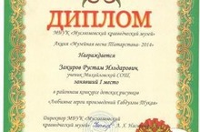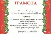 МКУ "Отдел образования Муслюмовского муниципального района Республики Татарстан" награждает ученицу 6 класса Мухаметханову Тансылу за активное участие на празднике, посвященном 128-летию со дня рождения Габдуллы Тукая (учитель: Гимаева Р.З.)