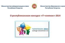 Дорогие ребята, уважаемые родители! Сообщаем вам о том, что стартовал новый этап республиканского конкурса "IT -Чемпион". Его новые сроки - с 15 марта по 10 декабря 2014 года. Регистрируя новых пользоваталей на портале Государственные услуги Республики Татарстан, разъясняя им удобства услуг в электронном виде и привлекая к осуществлению электронных платежей, вы имеете возможность стать IT - чемпионом среди школьников и получить главный приз - ноутбук, а также обменять полученные баллы на множество других призов.