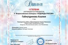 Воспитанница младшей дошкольной группы Гайнутдинова Азалия под руководством педагога Мингазетдиновой Ч.Р. участвовала в V Всероссийском конкурсе "Надежды России" и стала победителем I степени. Поздравляем!