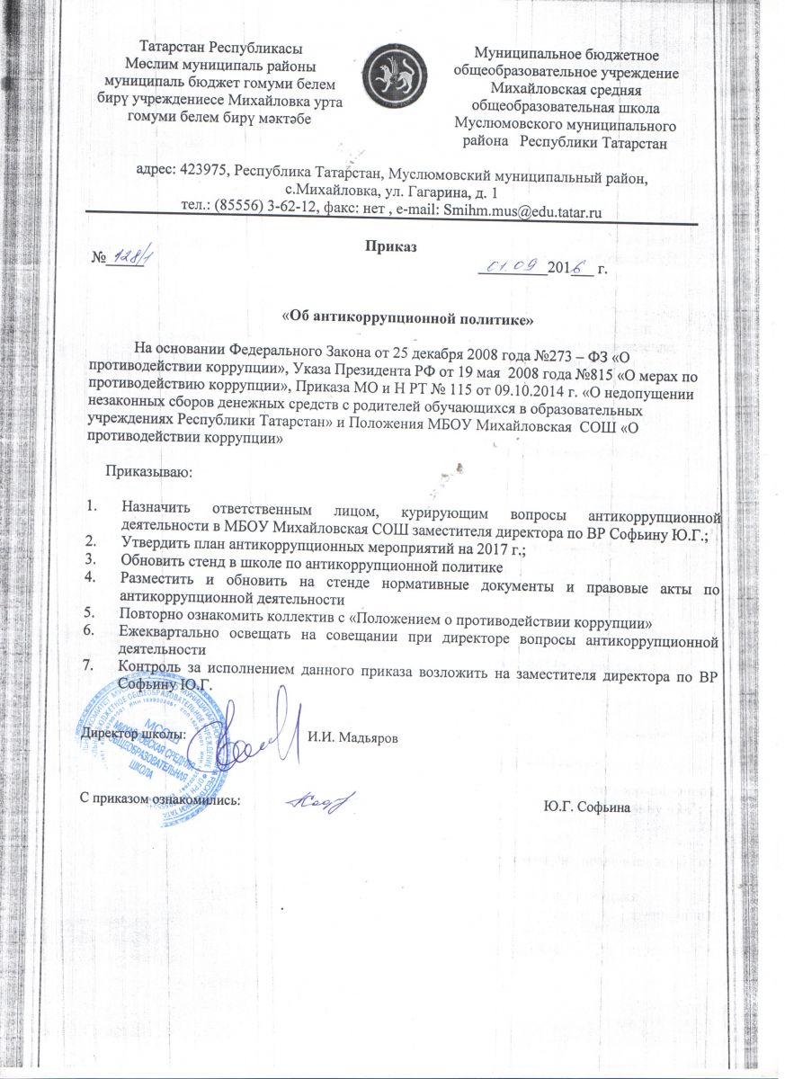 Приказ ОО Муслюмовского муниципального района о проведении Международного дня борьбы с коррупцией