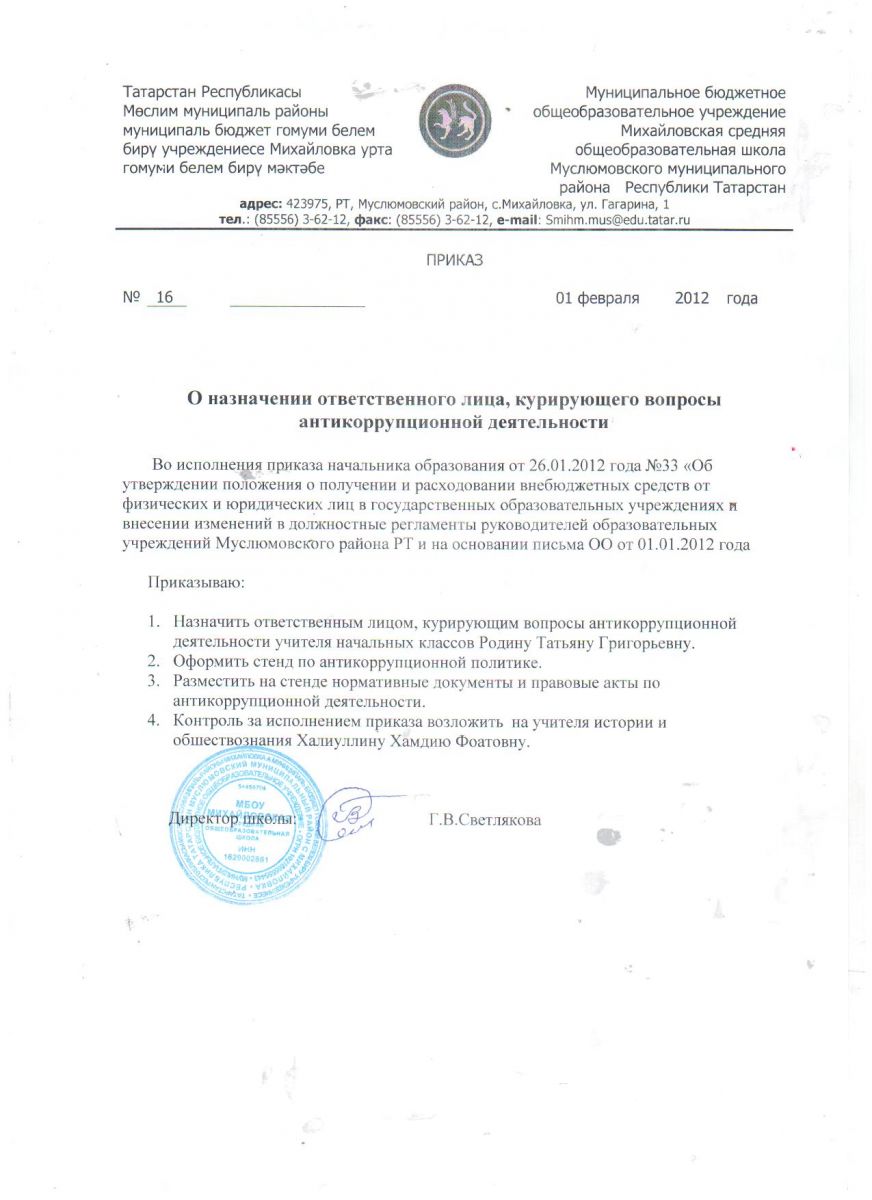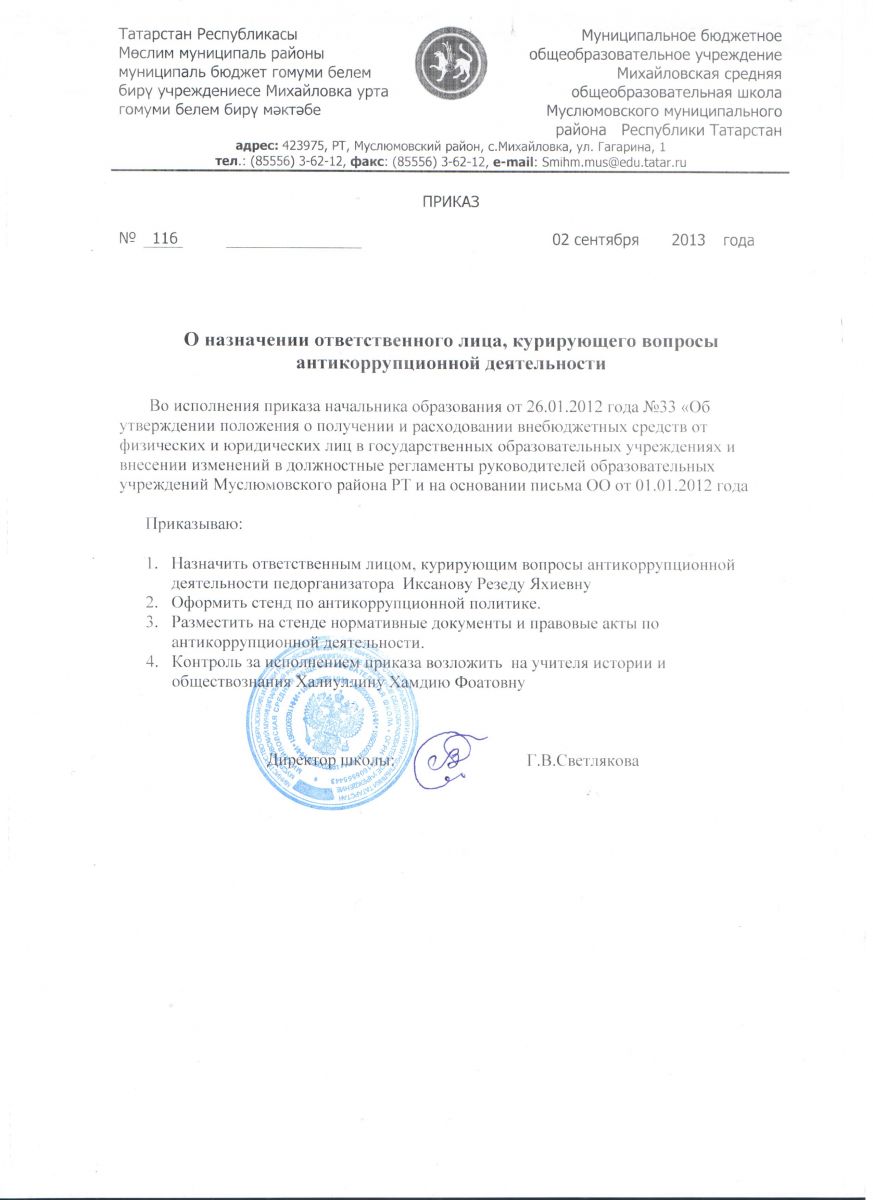 Приказ о назначении ответственного за антикоррупцию