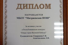 Туган телләр һәм халыклар бердәмлеге елы кысаларында башлангыч сыйныф укытучылары Әхмәтвәлиева Л.Н. белән Гыймранова Г.В. "Бөек җиңүнең яшь геройлары" исемле республика бәйгесендә актив катнашулары өчен диплом белән бүләкләнделәр.