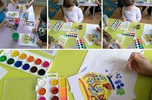 Свои впечатления и полученные знания дети отразили в работах на занятии по рисованию и в свободной деятельности, расписывая подносы, разделочные досочки и другую посуду.