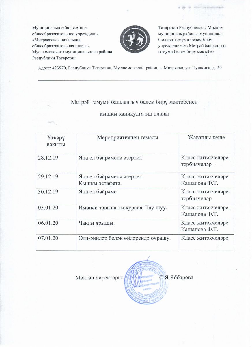 | Адрес: | 423970, Республика Татарстан, Муслюмовский район, с. Митряево, ул. Пушкина, д. 50 |