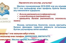 Хөрмәтле әти-әниләр, укытучылар! Мөслим гимназиясендә 2019-2020 нче уку елында 10-11 нче сыйныфлар өчен профиль буенча белем алу мөмкинлеге тудырыла. Гаризалар 1нче июньнән кабул ителә.