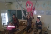 В рамках внутришкольного конкурса на лучший классный кабинет ученики 8а класса создали настоящее подводное царство: есть здесь и разноцветные рыбки, и яркие гирлянды водорослей и даже гигантский осьминог, свисающий с потолка. Большие молодцы ребята, а также их классный руководитель - Тимергалиева Э.В.