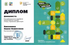 Член экологического объединения "Экокалейдоскоп",ученица 9 в класса Муслюмовской гимназии Биккинина Наиля стала финалистом республиканского марафона экологических знаний "Учись.Применяй.Действуй".