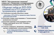 МБОУ "Муслюмовская гимназия" совместно с Казанским государственным медицинским университетом (КГМУ) объявляет набор на 2023-2024 учебный год в 9-11 классы по медицинскому профилю. Углубленное изучение биологии и химии. Получение теории основ медицины в "Альметьевском медицинском колледже. Практика на базе Медсанчасти ОАО "Татнефть" г. Альметьевск. Участие в конкурсах, предметных олимпиадах, научных конференциях, организованных КГМУ