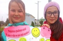 Члены организации "СМС-Дети"Муслюмовской гимназии организовали акцию "Поделись улыбкою своей". Они дарили всем прохожим смайлики и солнечное настроение.