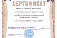 Учитель физики и математики Рафаэль Зарипов был награжден Сертификатом Министерства Образования и науки за участие в заочном этапе республиканской научной-практической конференции НПК «Мастерская учителя 21 века»