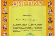 Учитель физики и математики Зарипов Р.З. награжден Дипломом За активное участие в Девятом заочном творческом Всероссийском конкурсе учителей математики, организованном журналом «Математика» совместно с Московским центром непрерывного математического образования.