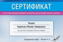 Учитель русского языка и литературы Зарипова Ф. Т. награждена сертификатом за активное участие в международном конкурсе «Весна в парках»