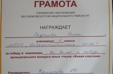 Масштабный проект «Живая классика» ежегодно проводится с 2011 года в целях популяризации чтения среди юного поколения, развития навыков публичных выступлений, содействия гражданско-патриотическому и духовно-нравственному воспитанию молодого поколения. 16 апреля в Муслюмовском муниципальном районе прошел муниципальный этап конкурса. Обучающийся 8 класса нашей школы Садриев Р. получил грамоту за победу в номинации "За волю к победе". Жюри конкурса оценивало не только выразительность чтения и грамотную речь, но и артистизм исполнения, умение оказывать эстетическое и эмоциональное воздействие на слушателей.