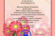 Мәктәпкәчә яшьтәге төркемдә тәрбияләнүче Шигапов Д. һәм аның җитәкчесе Сөләйманова Р. Т. "С любовью к маме" республикакүләм конкурста җиңүләре белән котлыйбыз! Яңа җиңүләр телибез!