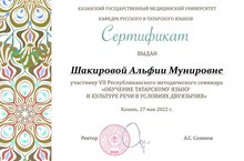 Казан дәүләт медицина университеты уздырган «Икетеллелек шартларында татар теленә һәм сөйләм культурасына өйрәтү» методик семинарында катнашып Шакирова А. М. һәм Кашапова Л. Ф. катнашучы сертификатлары алдылар.