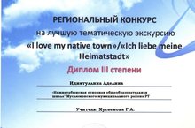 "Инглиз һәм немец телләрендә иң яхшы тематик экскурсия «I love my native town» / «Ich liebe meine Heimatstadt» төбәкара конкурста III дәрәҗә дипломга лаек булган 7 нче сыйныф укучысы Идиятуллина А. Р. котлыйбыз. Җитәкчесе Хөсәенова Г. Ә.. Иҗади уңышлар телибез