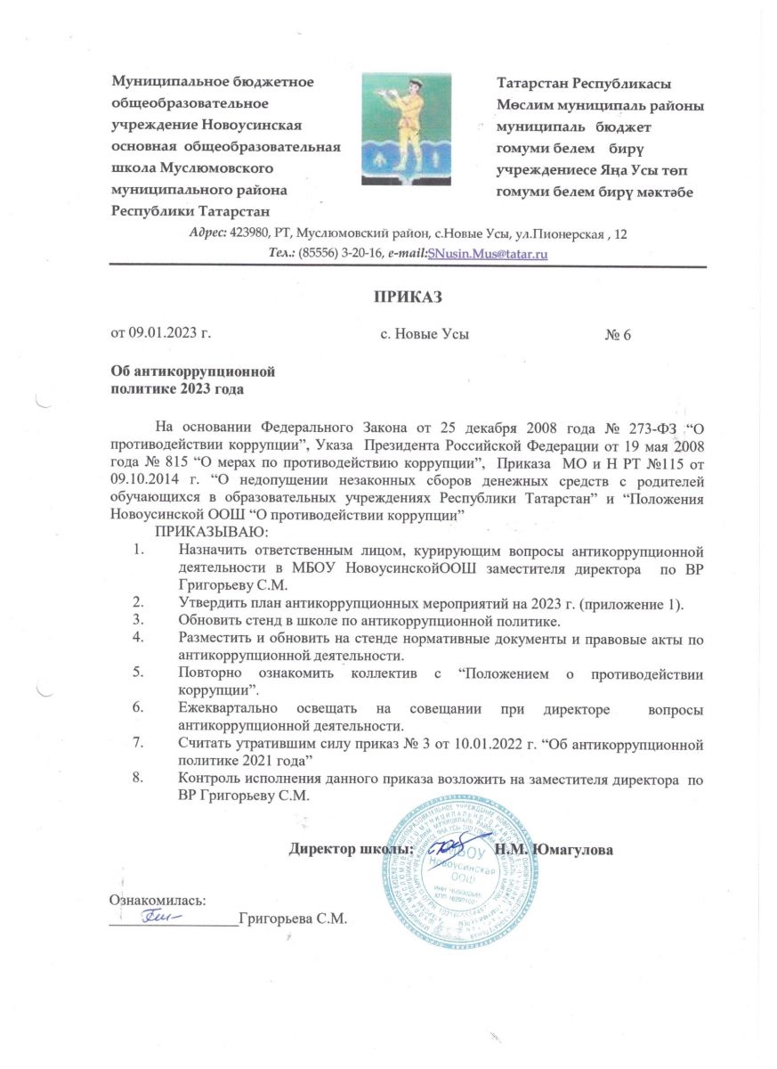 Приказ по школе "Об антикоррупционной политике" от 9 января 2023 года