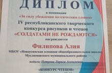 Наши достижения. Диплом IV республиканского творческого конкурса рисунков и чтецов "Солдатами не рождаются" 12.03.2022