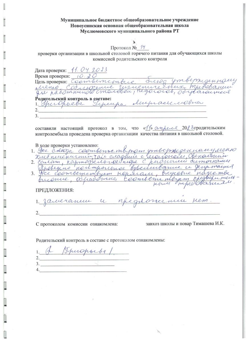 Протокол контроля родителями школьного питания от 2023 г.