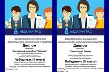 Учащиеся вокального отделения показали свое мастерство, приняв участие во Всероссийском конкурсе «Медалинград» и став победителями в номинации «вокальное и музыкальное творчество». Вокальный ансамбль «Шатлык» (рук. Шайгарданова А.Р.) - 2 место, Харитонова Рената (рук. Юсупова Г.М.) - 3 место. 21.05.2015