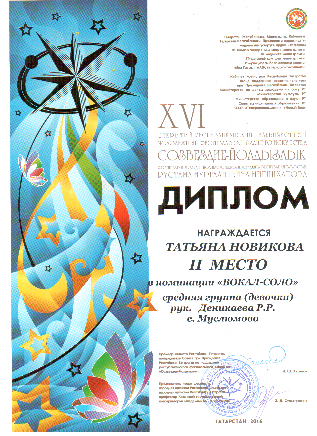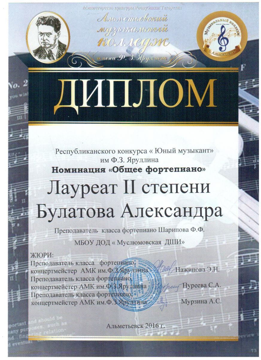 Булатова Александра. Диплом лауреата II степени Республиканского конкурса "Юный музыкант" им. Ф.З.