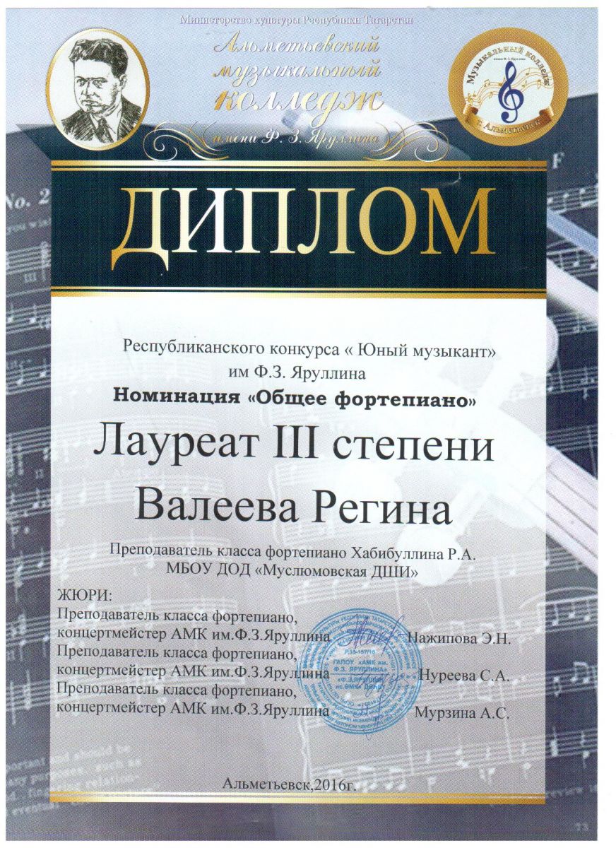 Валиева Регина. Диплом лауреата III степени Республиканского конкурса "Юный музыкант" им. Ф.З.