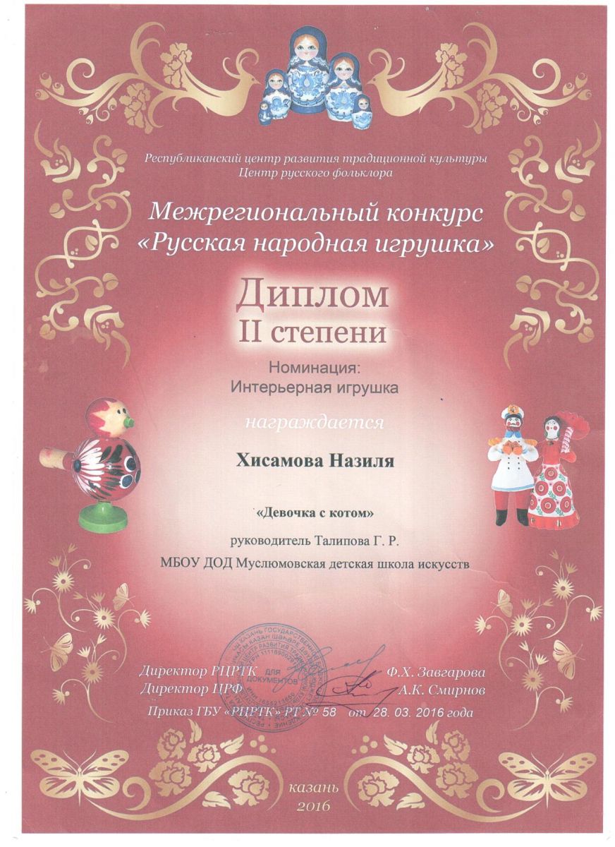 Хисамова Назиля. Дипломант II степени межрегионального конкурса "Русская народная игрушка".