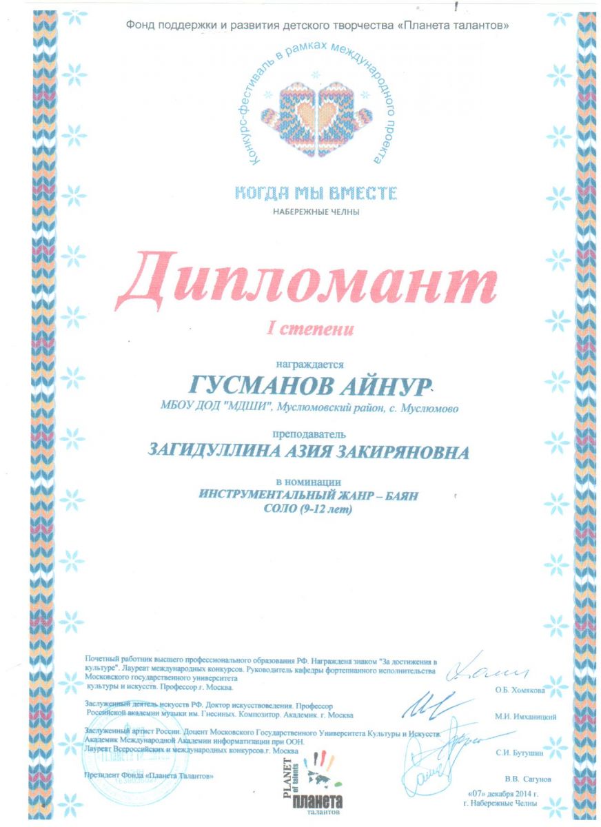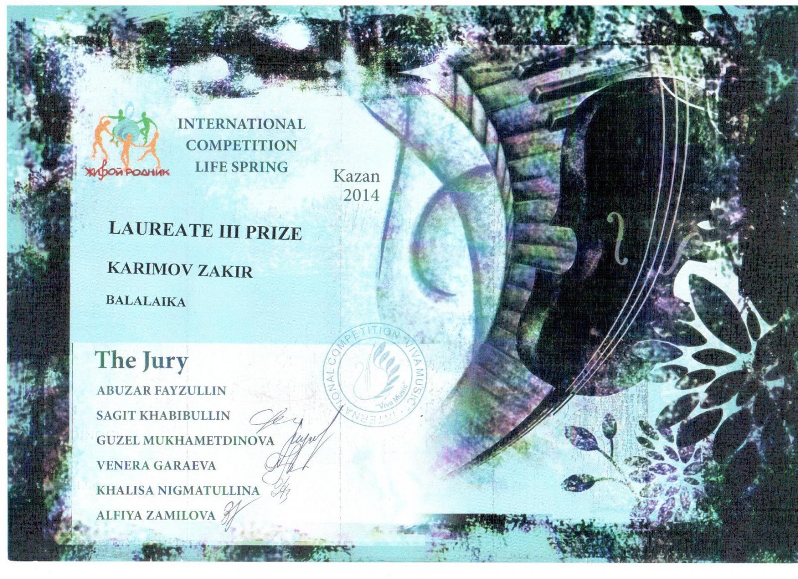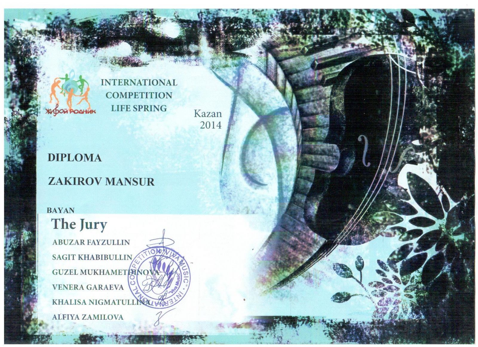 Закиров Мансур. Диплом V Международного конкурс-фестиваля народного творчества «Живой Родник».