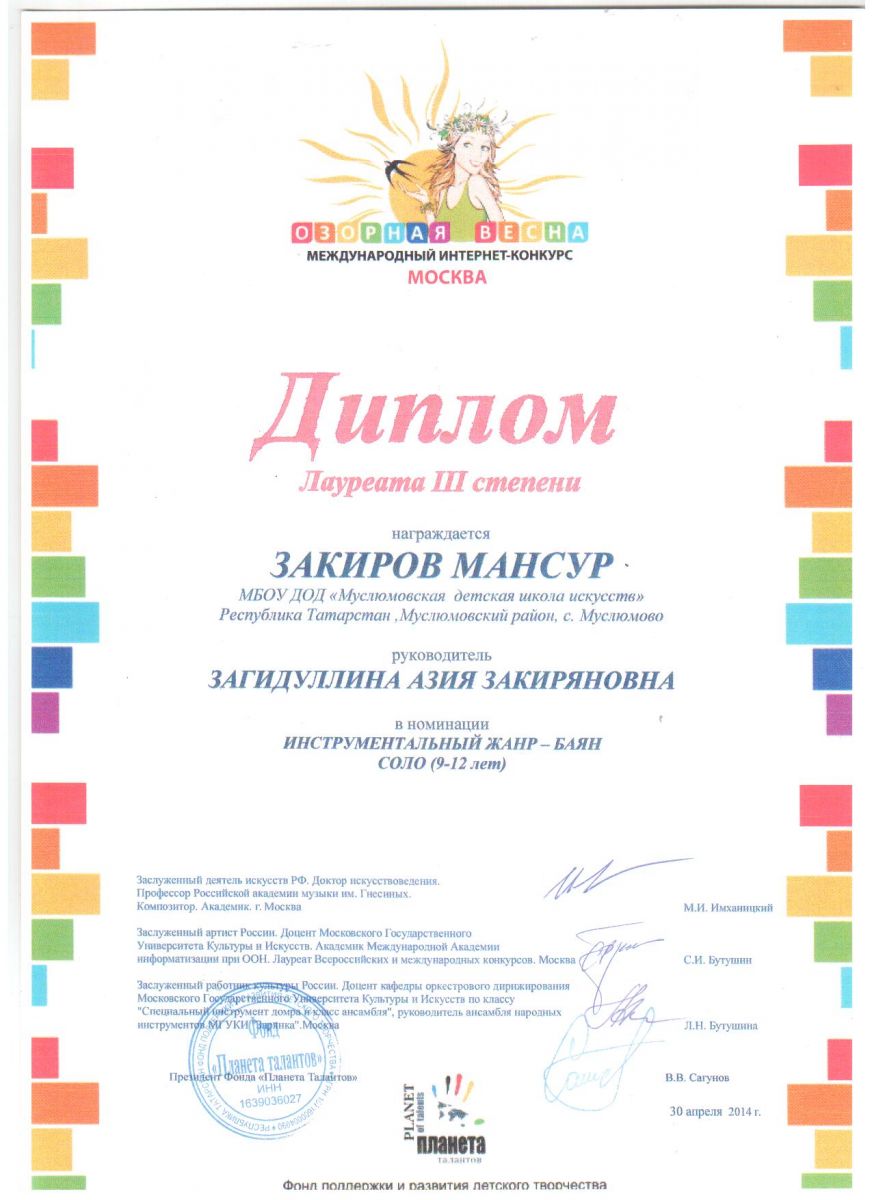 Закиров Мансур. Диплом лауреата III степени Международного интернет конкурса "Озорная весна".