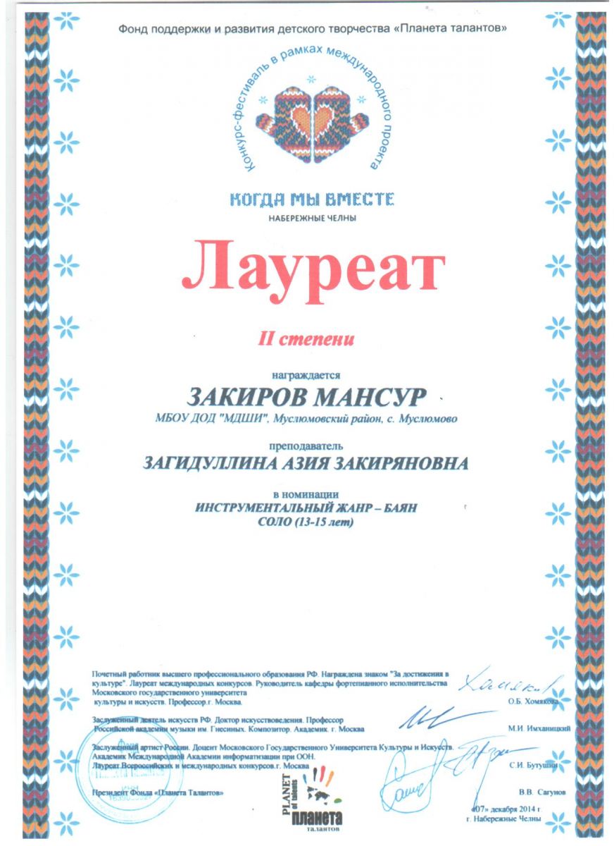 Закиров Мансур. Дипломант II степени международного фестиваль-конкурса "Камаз собирает друзей".