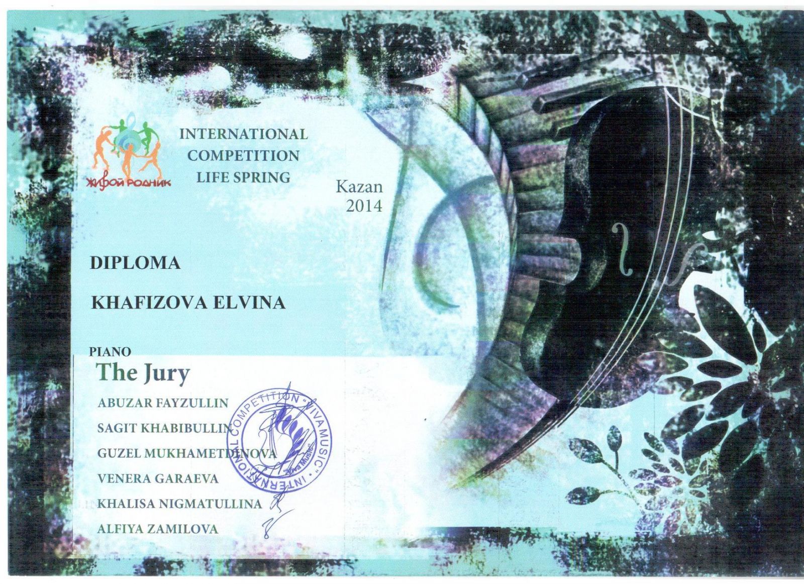 Хафизова Эльвина. Диплом V международного конкурс-фестиваля народного творчества «Живой Родник».