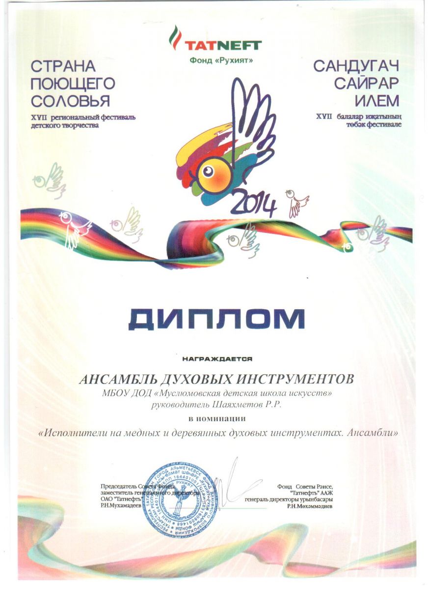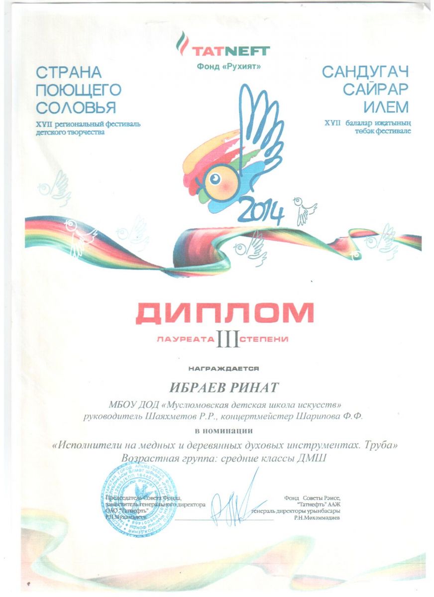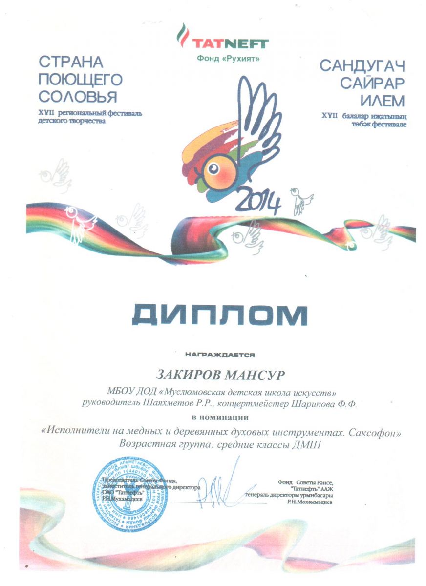 Закиров Мансур. Диплом XVII регионального фестиваля детского творчества "Страна поющего соловья".