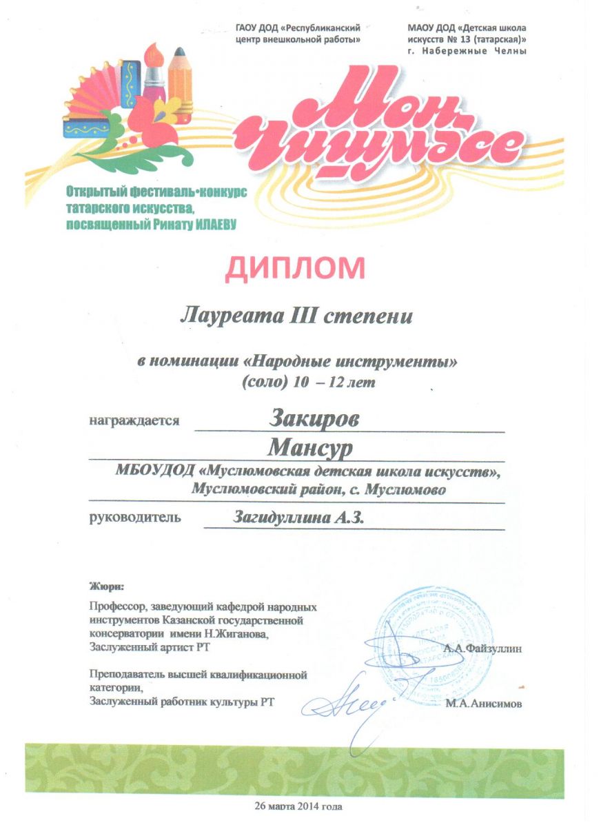 Закиров Мансур. Лауреат III степени открытого фестиваль-конкурса татарского искусства "Мон чишмэсе".