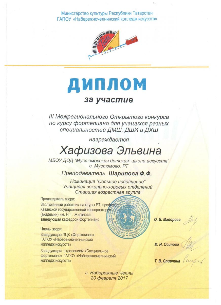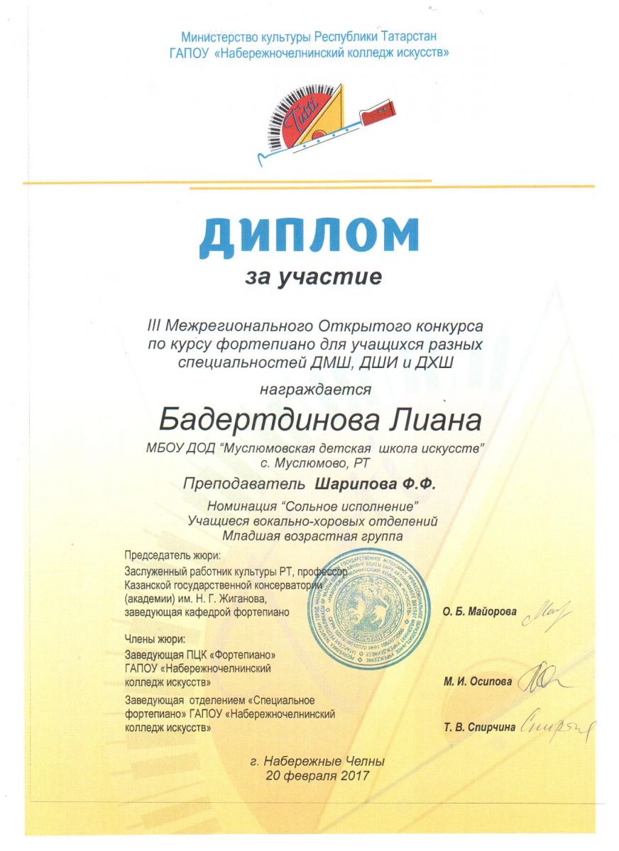 Аделя Ханнанова. Диплом XX регионального фестиваля детского творчества "Страна поющего соловья".