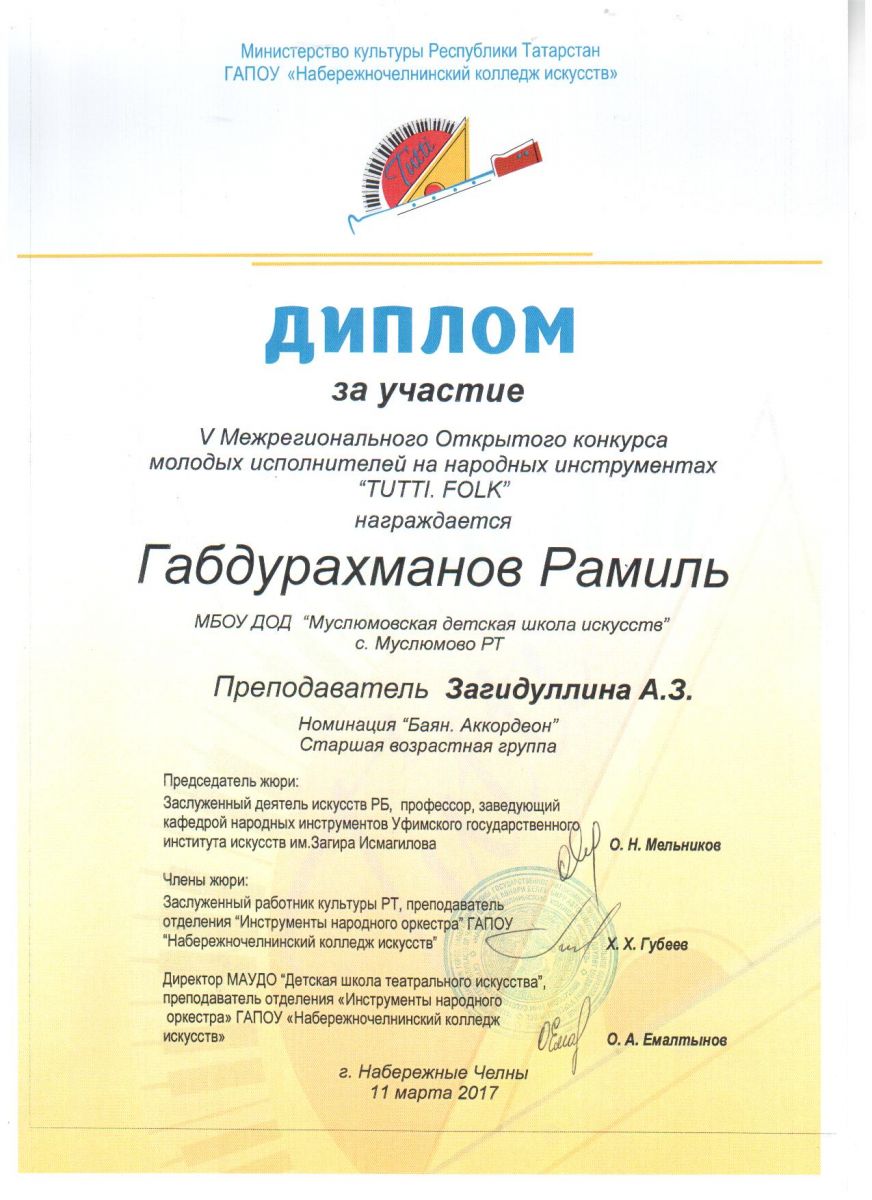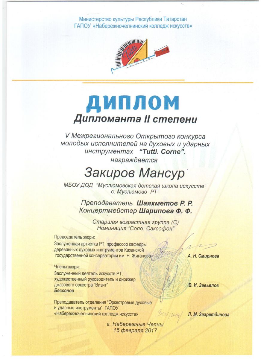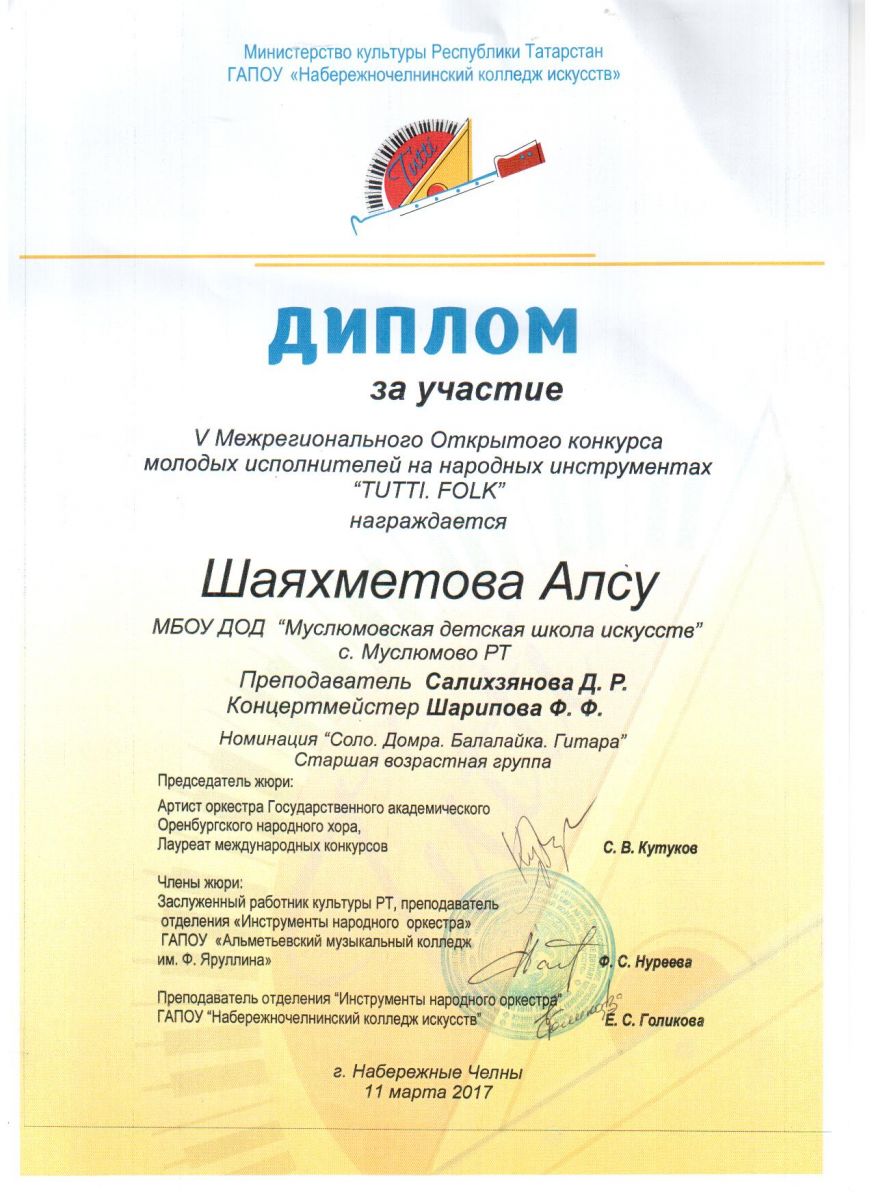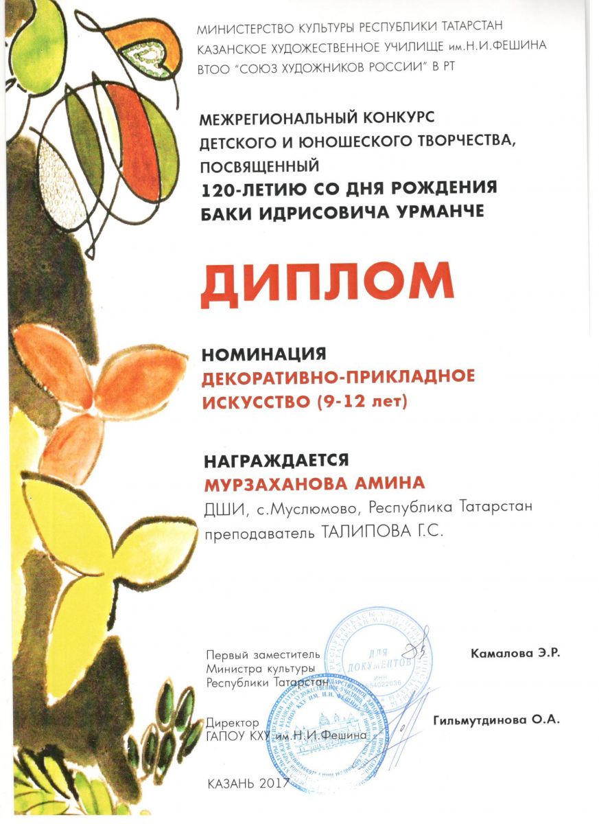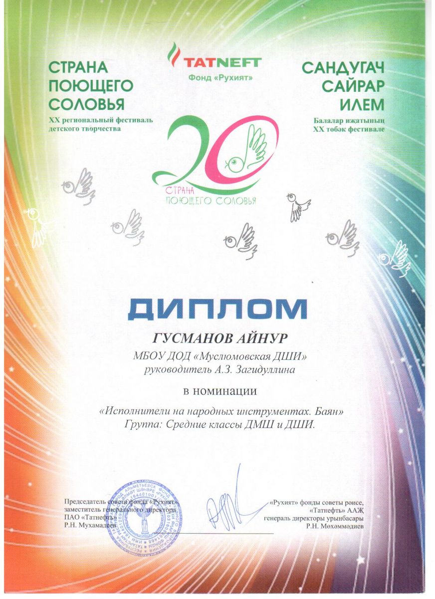 Гусманов Айнур. Диплом XX регионального фестиваля детского творчества "Страна поющего соловья".