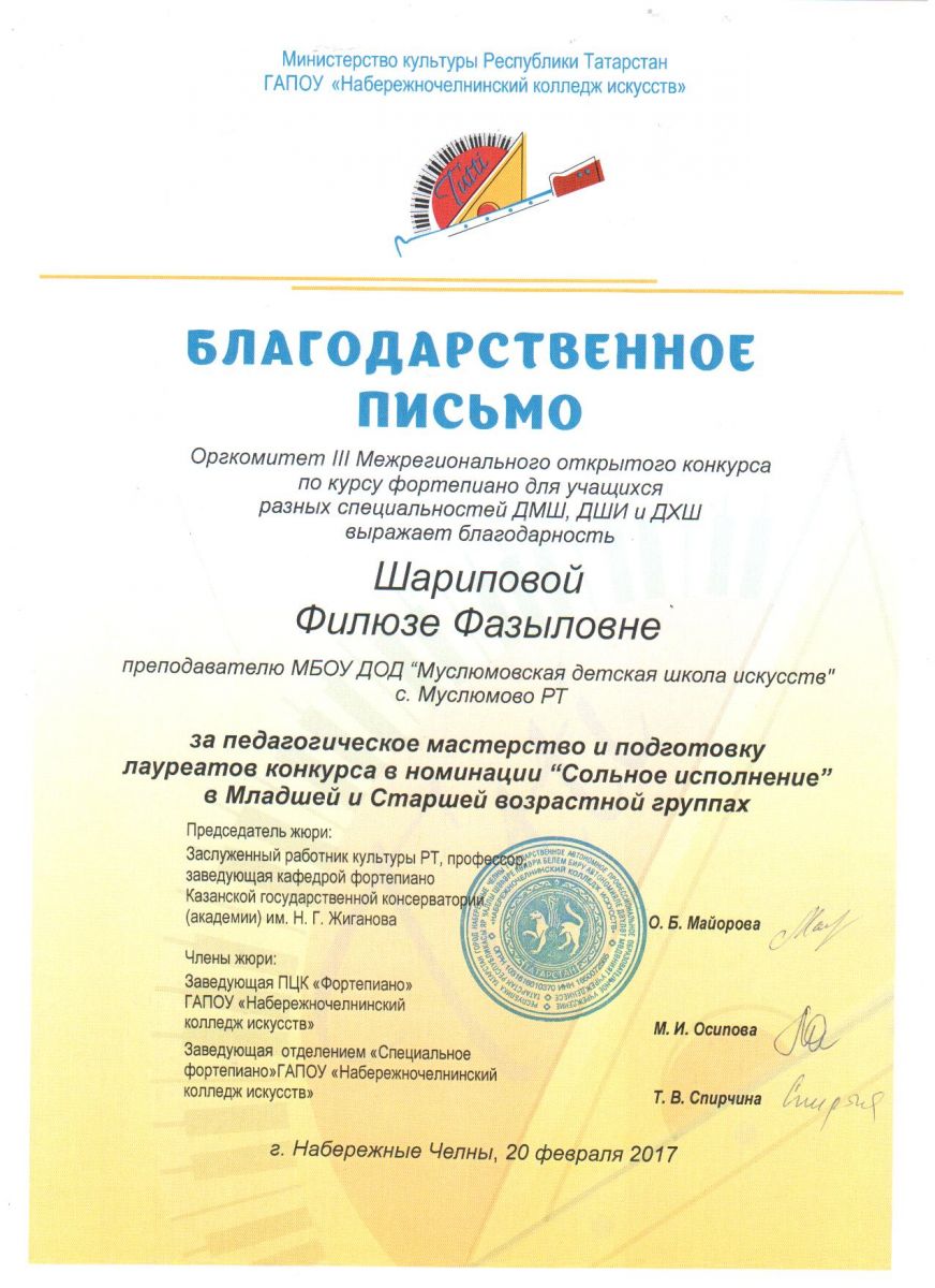 Шарипова Филюза Фазыловна. Благодарственное письмо оргкомитета III  Межрегионального Открытого конкурса по курсу фортепиано для учащихся разных специальностей ДМШ, ДШИ и ДХШ