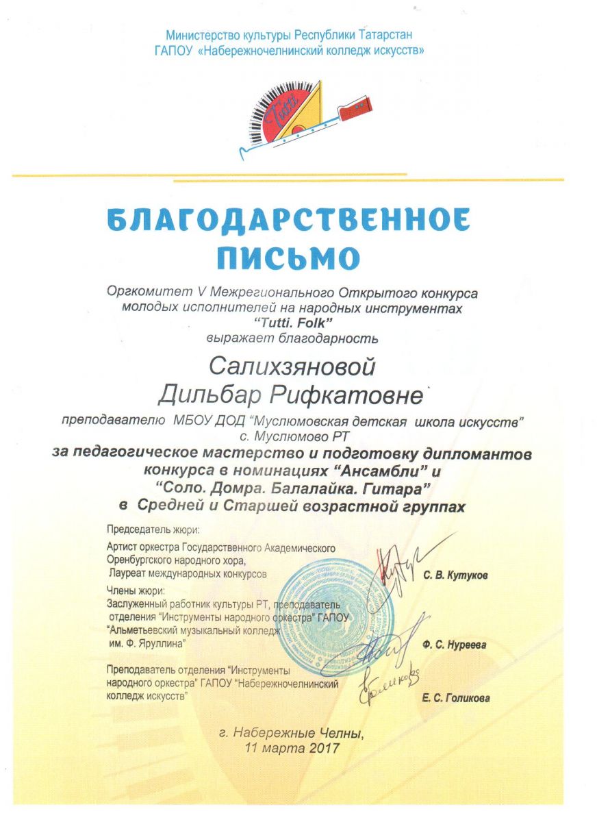 Салихзянова Дильбар Рифкатовна. Благодарственное письмо оргкомитета  III  Межрегионального Открытого конкурса молодых исполнителей на народных инструментах "Tutti. Folk"