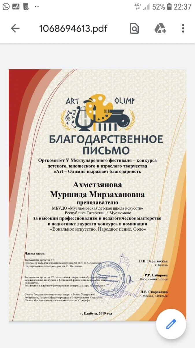 Благодарственное письмо Юсуповой Гульназ Моряковне за высокий профессионализм и педагогическое мастерство в подготовке лауреата конкурса в номинации "Вокальное искусство. Эстрадный вокал".Международный фестиваль-конкурс детского, юношеского и взрослого творчества "Grande Stella".