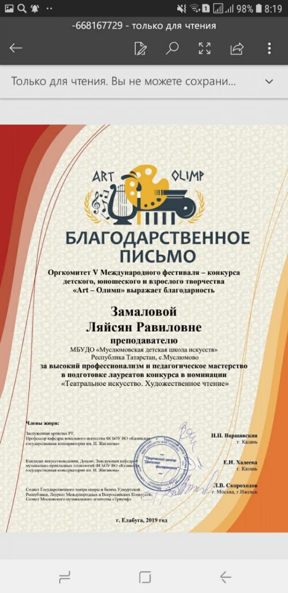 Благодарственное письмо Замаловой Лейсян Равиловне за высокий профессионализм и педагогическое мастерство в подготовке лауреата конкурса в номинации " Театральное искусство. Художественное чтение.