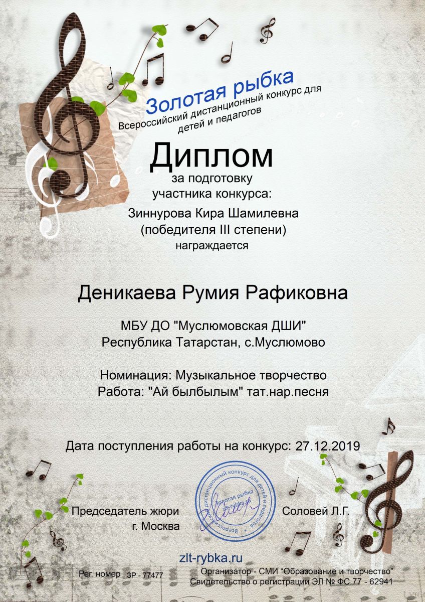 Деникаева Румия Рафиковна. Диплом за подготовку участника конкурса. Всероссийский дистанционный конкурс для детей и педагогов.