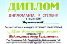 Милли мәдәниятләр һәм гореф гадәтләр елы кысаларында уздырылган балалар иҗатының бөтенрәсәй "Мин бит татар малае" дигән конкурста катнашып, Шайхетдинов Әмир "Иң кыю малай" номинациясендә II дәрәҗә дипломат булды. Киләчәктә дә аңа уңышлар телибез.