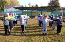 В детском саду утренняя гимнастика проходит на свежем воздухе.
