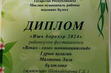 "Яшь бөреләр - 2024" районкүләм талантлы балалар фестиваленең йомгаклау концертында катнашып, Маликова Лиза "Вокал-соло" номинациясендә I урын яулады. Лизага киләчәктә уңышлар телик.
