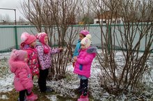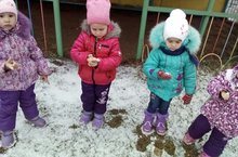Дети средней группы на прогулке наблюдали за первым снегом, знакомились со свойствами снега.
